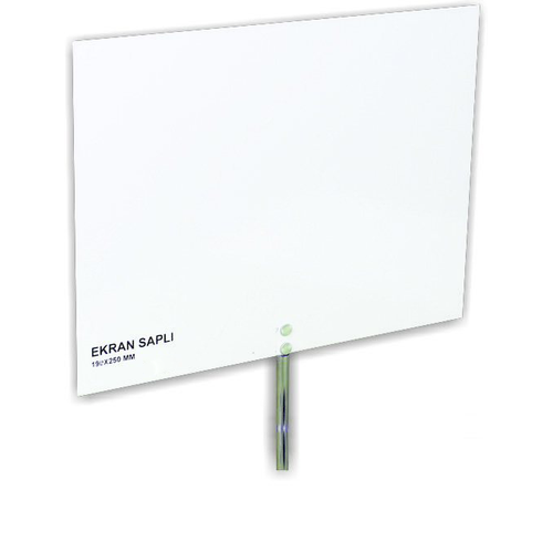 Saplı ekran (190×250 mm), optik deneylerde kullanılan beyaza boyalı metal levhadan üretilmiş dayanıklı bir fizik laboratuvar ekipmanıdır.