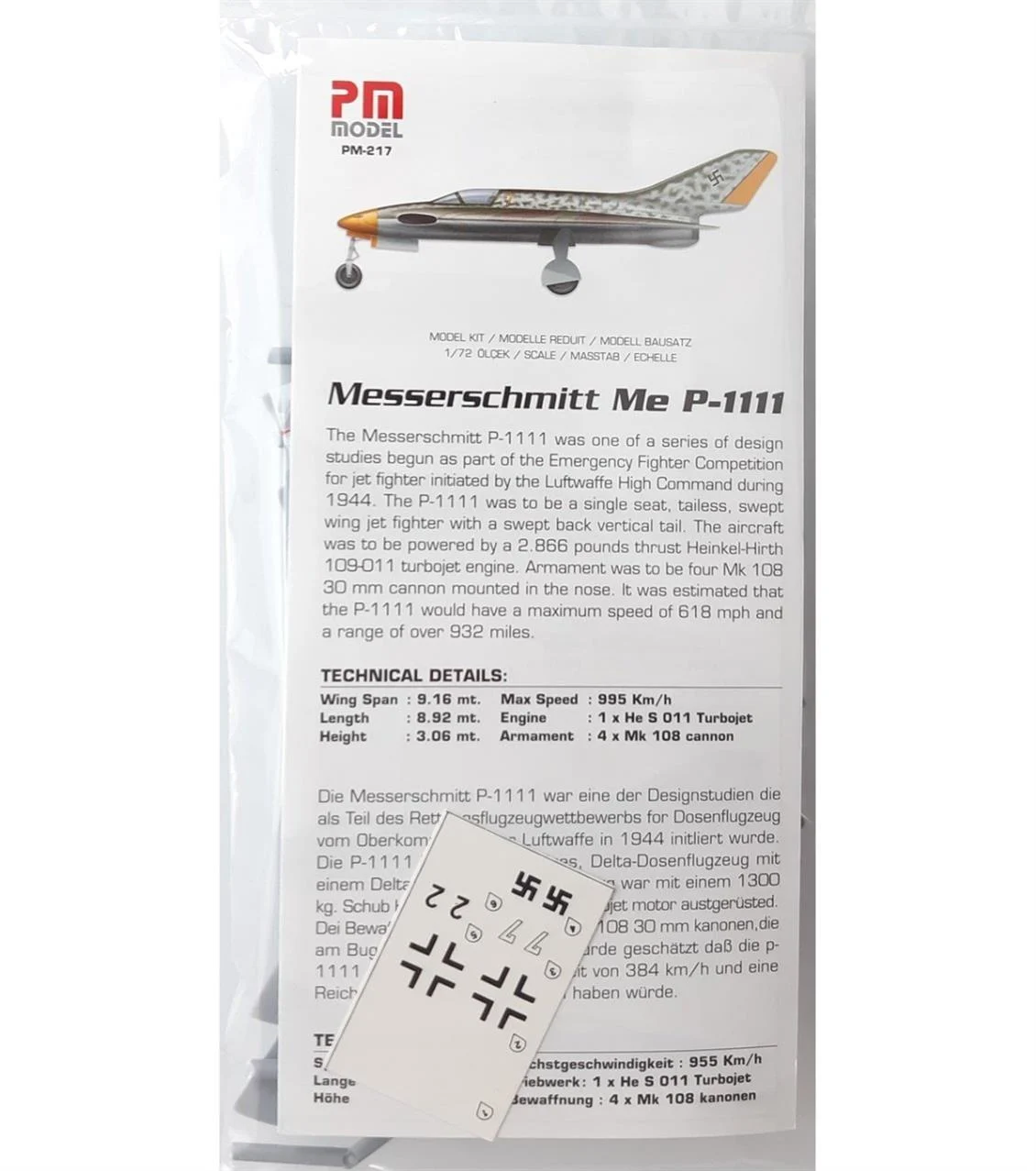 PM Model 217 1/72 Ölçek, Messerschmitt P.1111 Avcı Uçağı, Plastik Model kiti